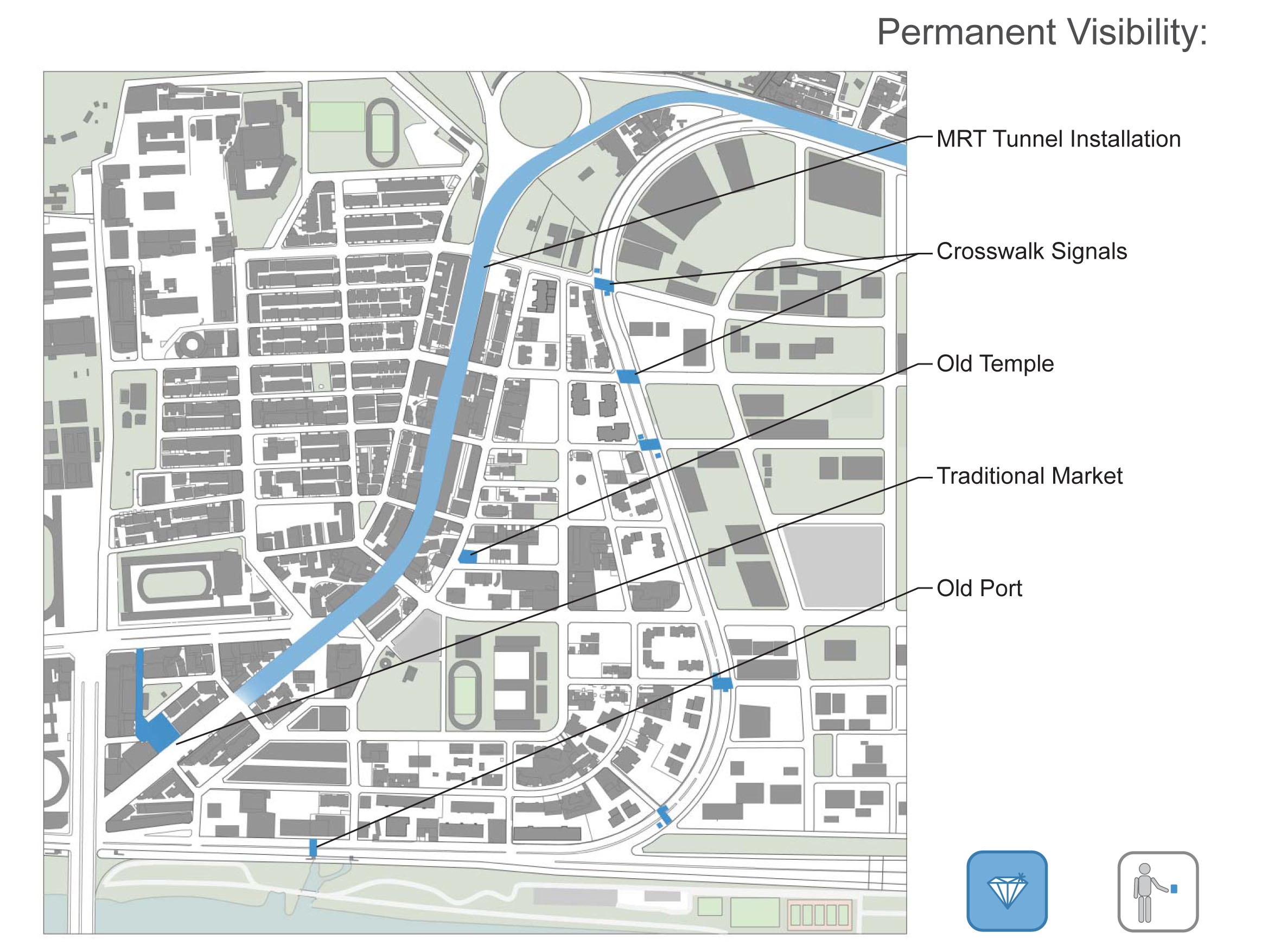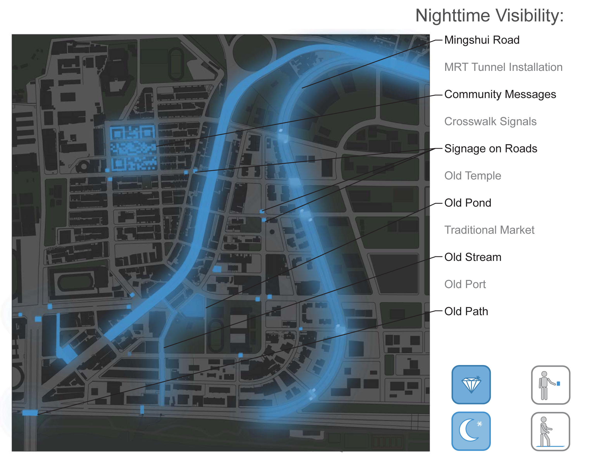 We came up with a series of mysterious, hidden, and playful reminders of the river life that had existed in this place before urbanization, rendered in placid blue and glow-in-the-dark paints. We prototyped several parts in the city, and our proposal was chosen to be developed.