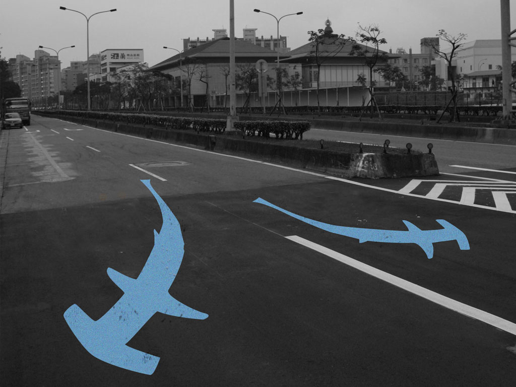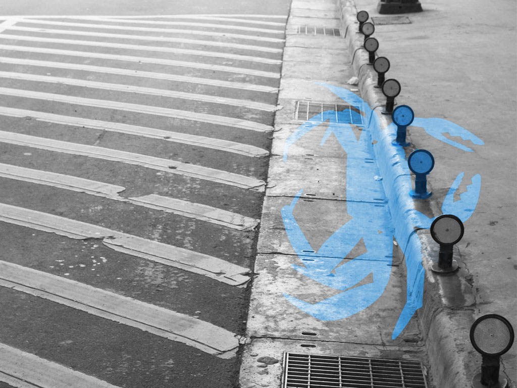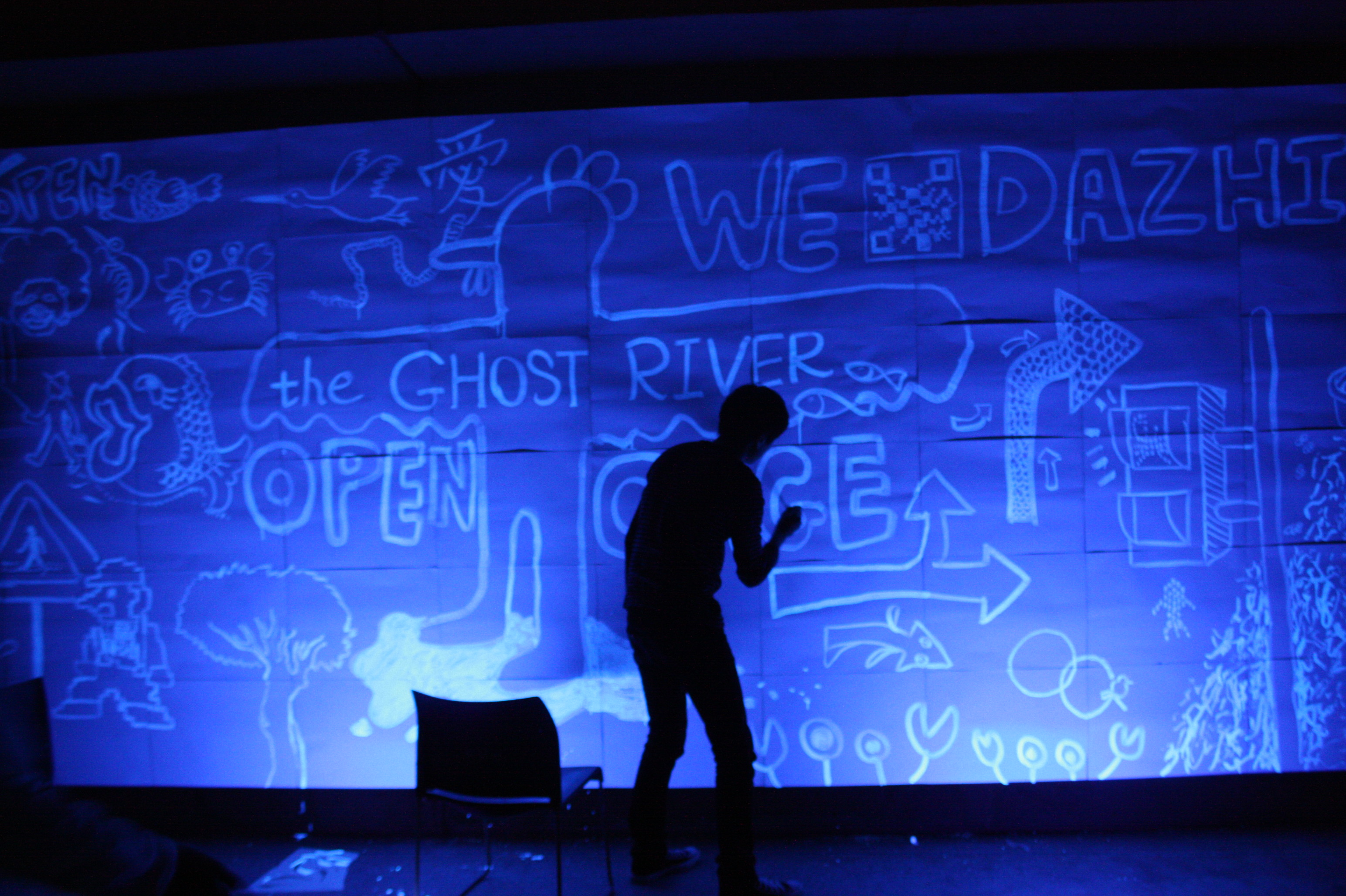 We did a guerilla installation of many of the smaller pieces over a night, using blue and UV paints and electronics to modify road signage in shifting, playful reminders of life along the old river. Custom crosswalk signals replaced people with river animals. We transformed turn arrows into sharks that appeared under black light installed on street poles.